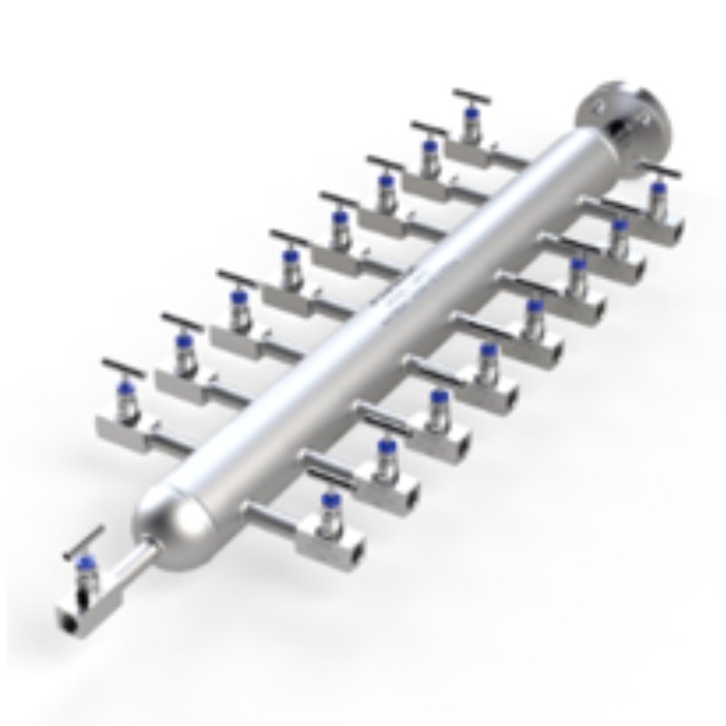 Air header is a pipe connected with number of valves having one inlet and one drain each at the end of pipe and in between are numerous outlets and valves connected to the body. Outlet ports can be from 4-way up to 30-way, inlet and drain connections can be flanged, coupling, ball valve, needle valve, etc.